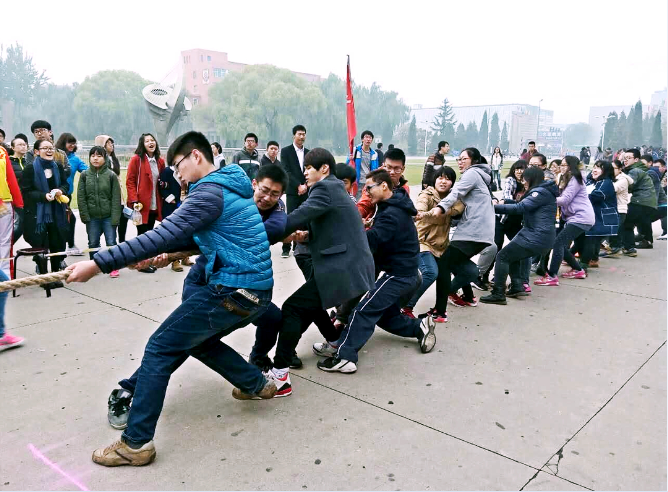 在八点四十分左右,拔河比赛举行开幕式,由校领导发表讲话,宣布比赛正式开始。九点时全员积极进行热身运动,为接下来的对战做好充足准备。当比赛的哨声吹响,公司运动员马上进入状态,铆足了劲往后拉。场外同学自发组成啦啦队,为队员们高呼加油,呐喊声震彻广场。公司运动员个个热情高涨,努力拼搏,与对方僵持不下,场内场外气氛激烈,比赛进入高潮。激烈的角逐之后公司因体力不支惜败,但同学们不怕受伤,勇往直前的精神风貌却成为本次拔河比赛最靓丽的风景线。