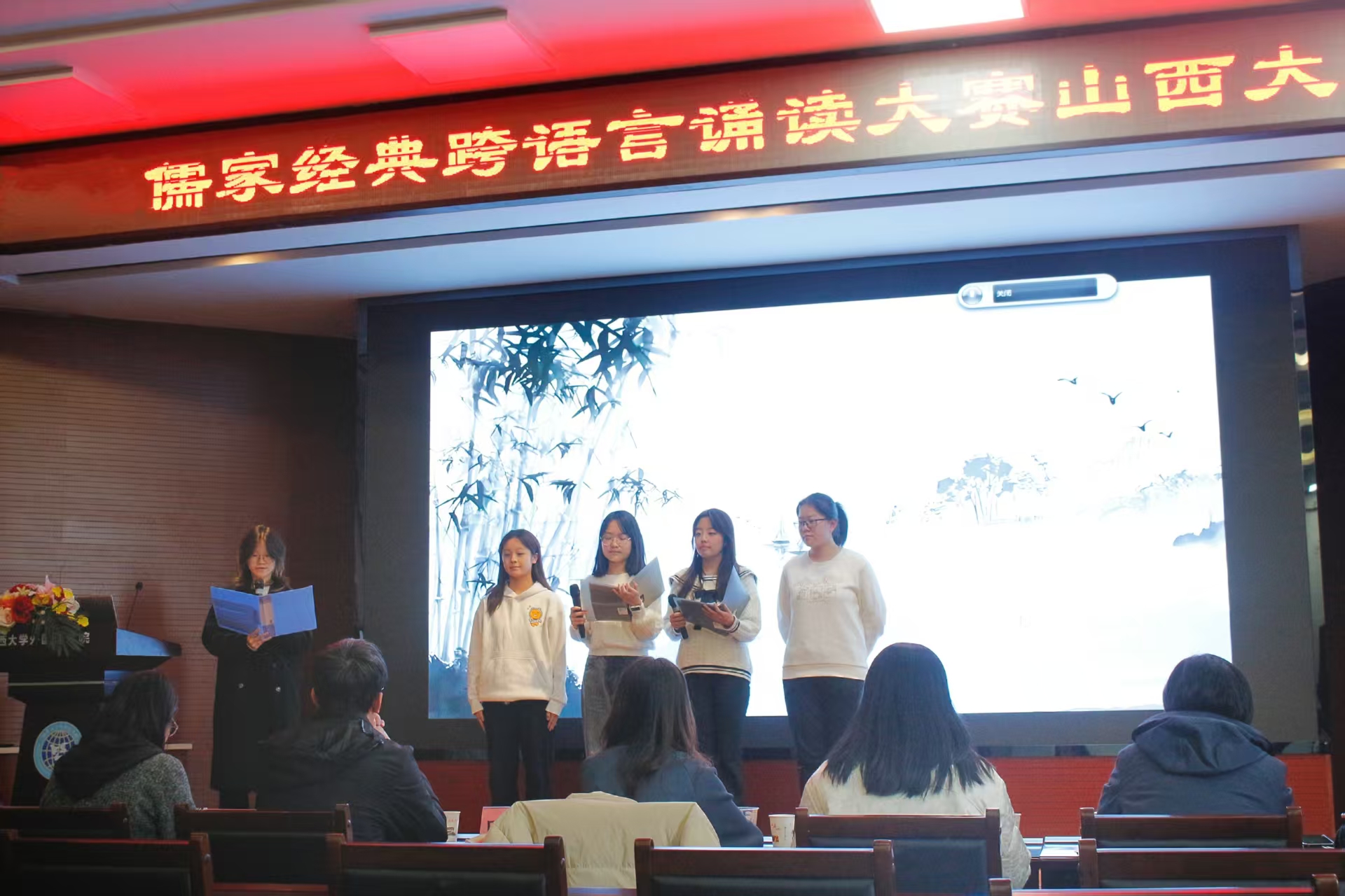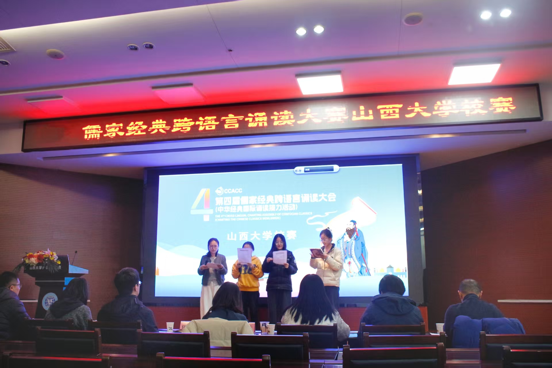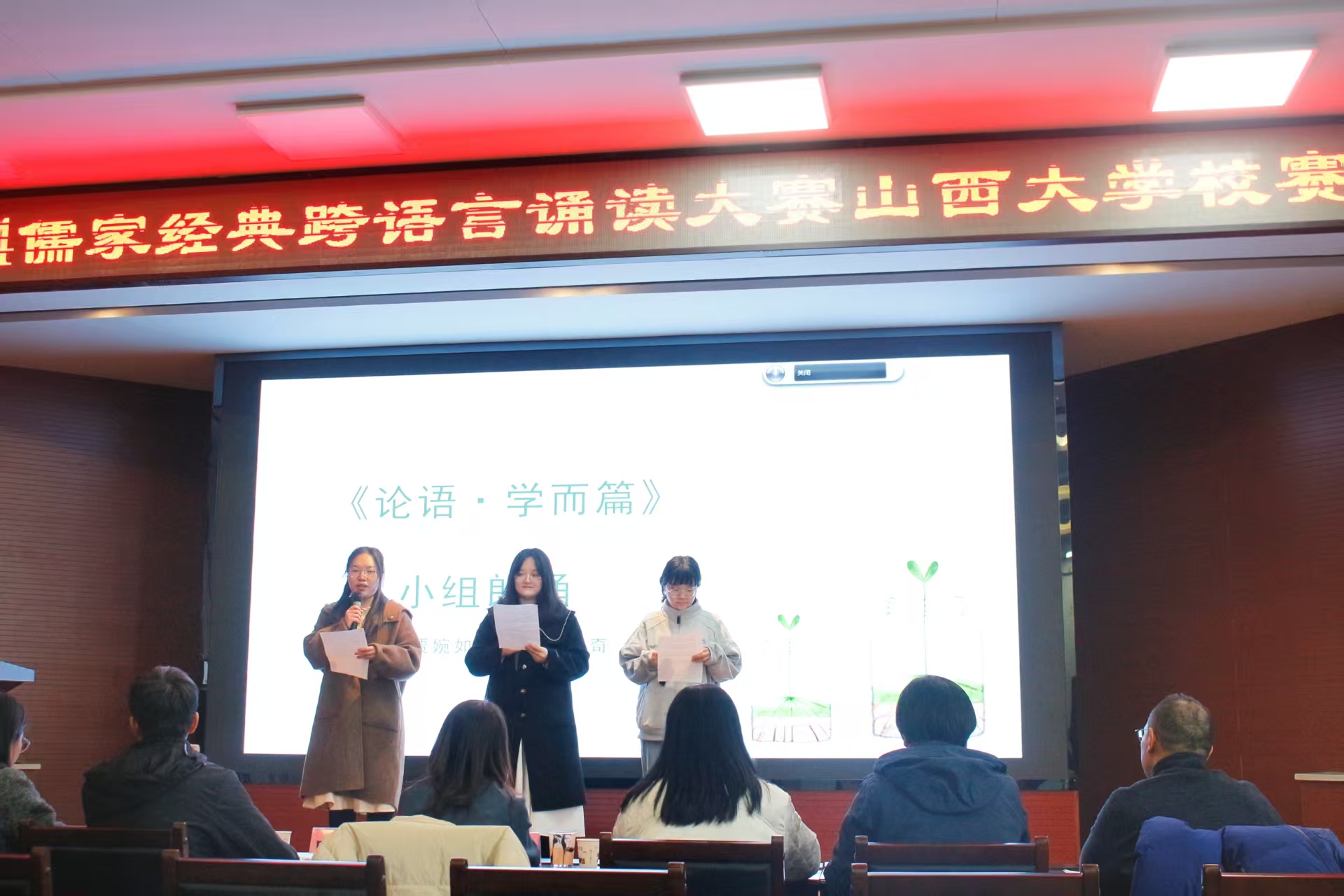 活动当天,现场气氛热烈非凡。7组参赛选手分别运用英语、法语、日语等多语言进行诵读表演,以独特的视角和表现形式诠释经典。从英语的流畅自然,到法语的浪漫优雅,再到日语的细腻婉转,选手们用不同的语言展现了儒家经典跨越文化的独特魅力。