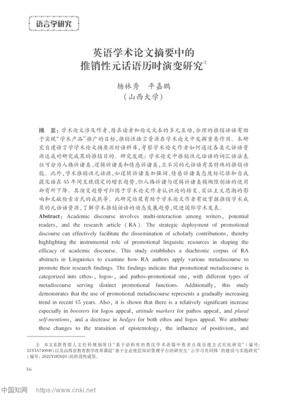 杨林秀教授与其博士研究生平嘉鹏在CSSCI集刊《复旦外国语言文学论丛》(2025年第3期)发表题为“英语学术论文摘要中的推销性元话语历时演变研究”的研究论文。该刊物由复旦大学外文学院主办,是中文社会科学引文索引(CSSCI)来源集刊;中国人文社科核心(AMI)A集刊,在业界影响广泛,在各种刊物评价体系中获得好评, 并获得相关领域专家学者的高度认可。