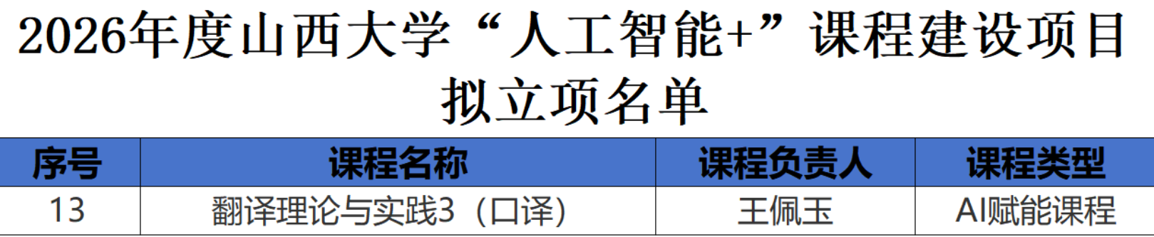 近日,根据教务处《关于2026年度sunbet申搏“人工智能+”课程建设项目立项结果的公示》(教务处〔2026〕513号)通知,经个人申报、单位推荐及专家评审,公司王佩玉老师主持申报的“人工智能+”课程建设项目——《翻译理论与实践3》(口译)成功立项。