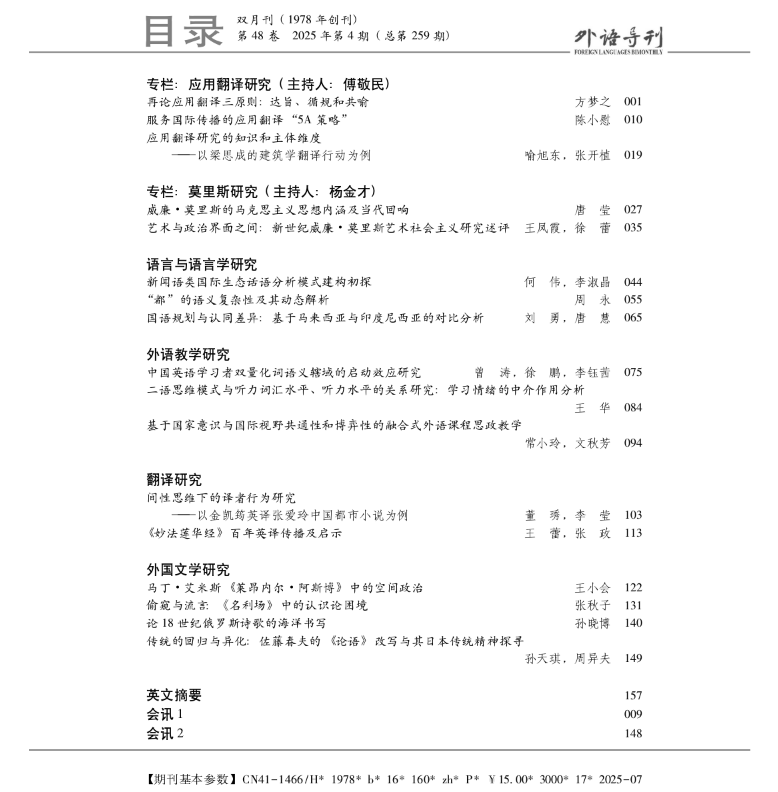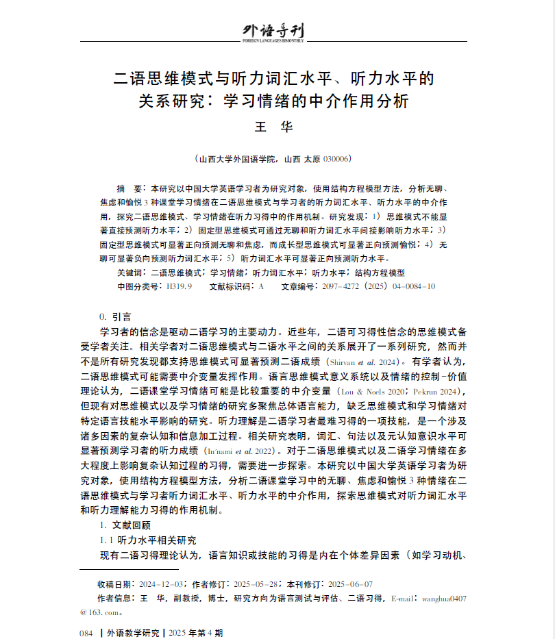 公司王华副教授在《外语导刊》2025年第4期发表题为“二语思维模式与听力词汇水平、听力水平的关系研究:学习情绪的中介作用分析”的研究论文。《外语导刊》(Foreign Languages Bimonthly),原《解放军sunbet申搏学报》,创刊于1978年,由国防科技大学sunbet申搏主办,是外国语言文学研究学术刊物,现为CSSCI来源期刊、中文外国语类核心期刊和复印报刊资料重要转载来源期刊。