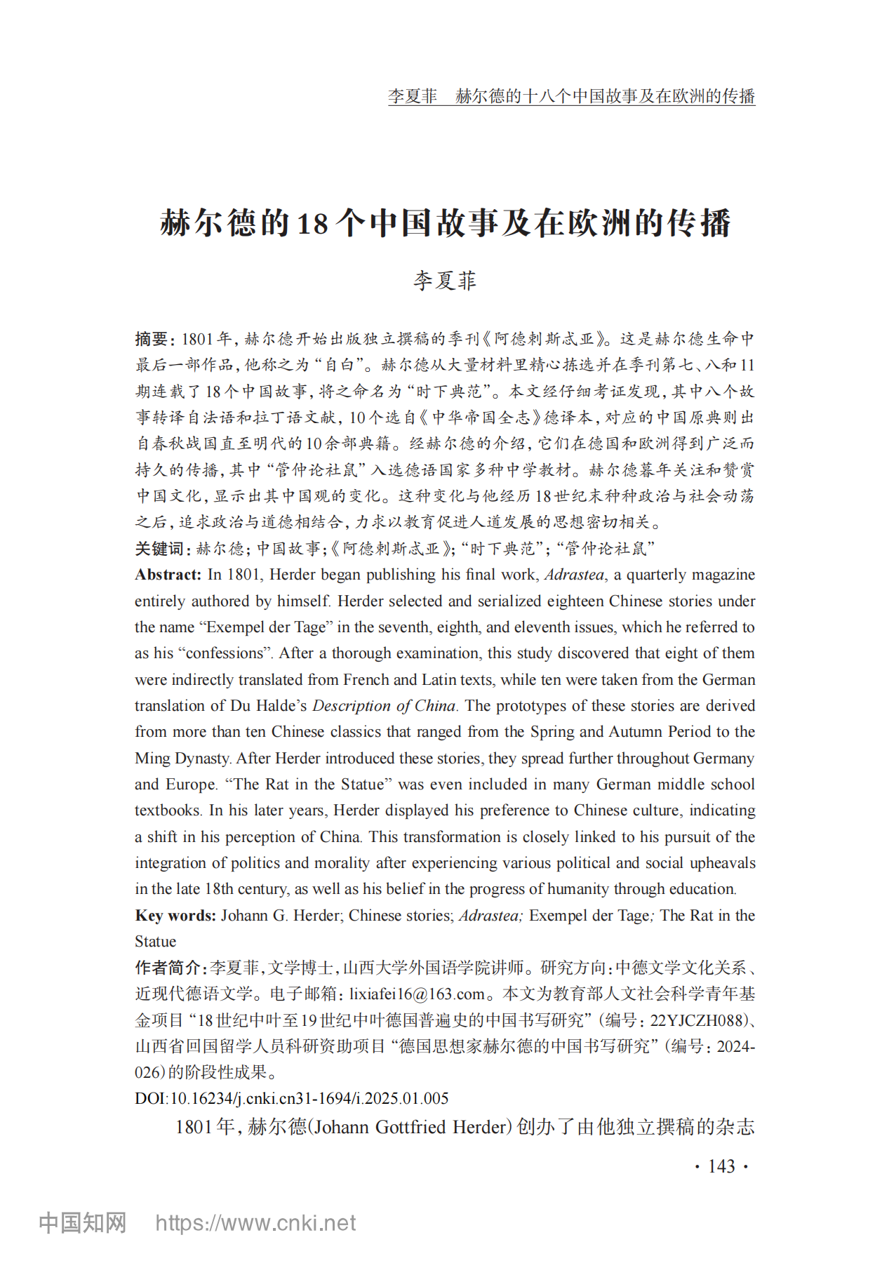 公司德语系教师李夏菲在《中国比较文学》2025年第1期发表题为《赫尔德的18个中国故事及在欧洲的传播》的论文。《中国比较文学》季刊1984年创刊,是中国大陆比较文学与世界文学权威专业期刊,属CSSCI来源期刊、全国中文核心期刊、中国人文社科核心期刊。