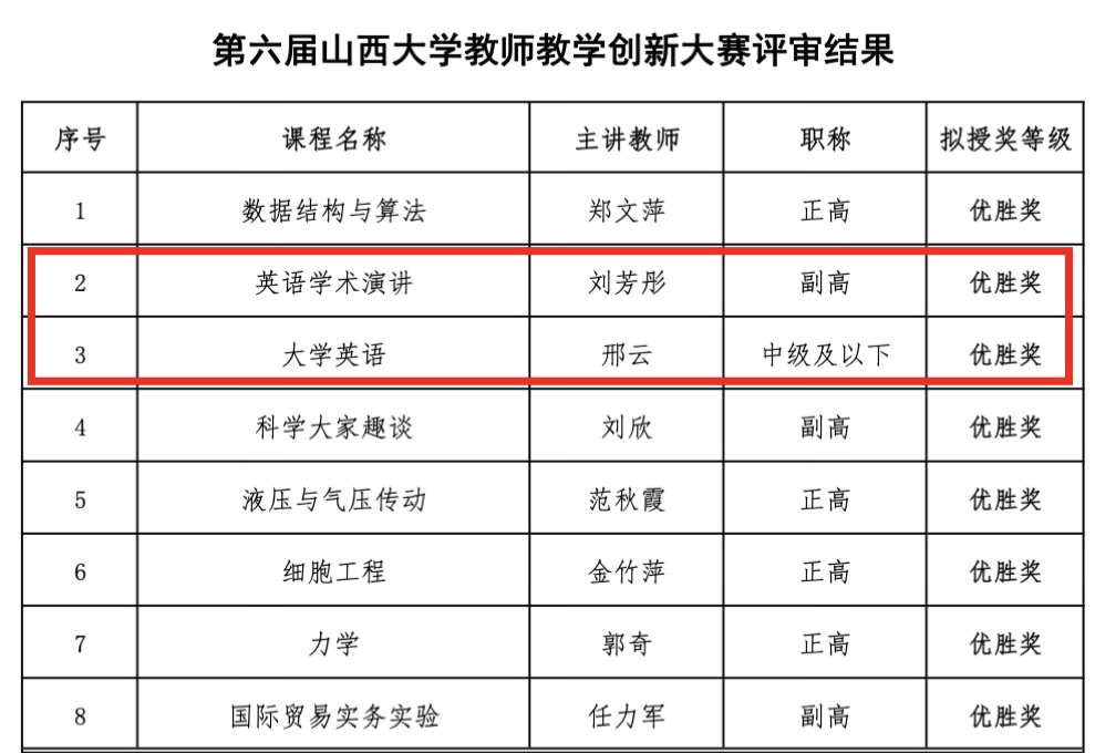 近日,第六届全国高校教师教学创新大赛sunbet申搏校级选拔赛圆满落幕。公司教师团队在本次比赛中表现突出,取得优异成绩。刘芳彤、杨林秀教师团队依托《英语学术演讲》课程的创新实践,在新文科副高组中荣获优胜奖;邢云、李枫、张碧慧、王华教师团队凭借《大学英语》课程的教学创新成果,在基础课程中级及以下组中荣获优胜奖。刘芳彤团队与邢云团队将代表学校参加省级比赛,进一步展示公司教学创新成果。