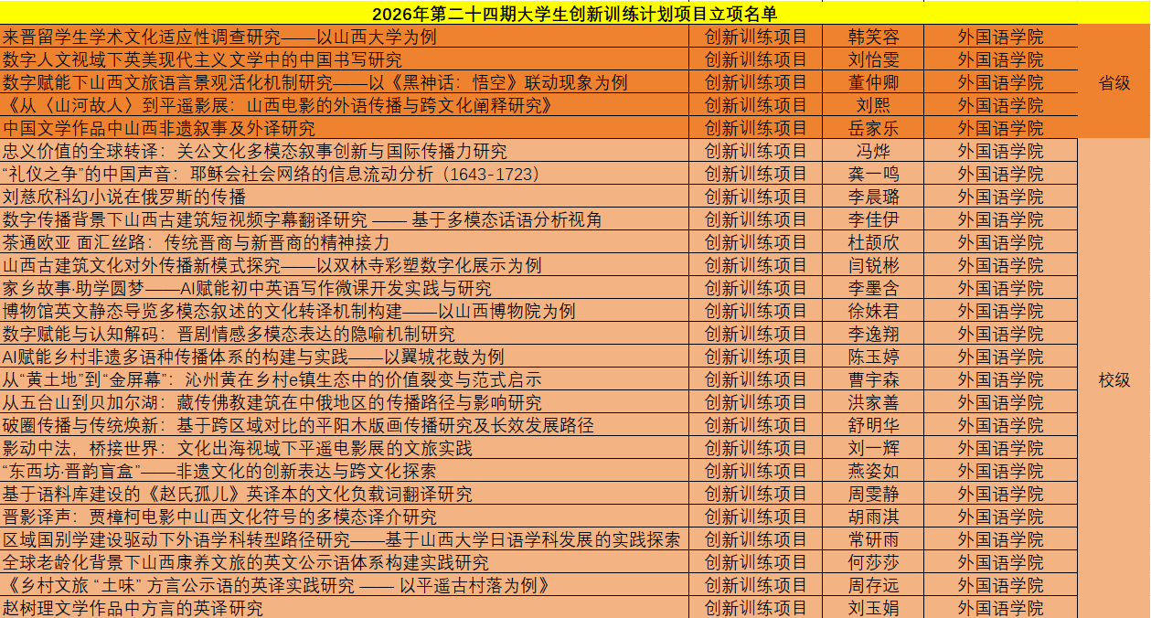在学院全方位统筹支持、专业教师悉心指导及参赛员工全力备战下,公司2026年大创项目立项质量稳中有升,选题更具前沿性、实践性与地域特色。从项目布局来看,今年公司大创项目始终立足外语专业优势,深度融合数字人文、跨文化传播、文旅融合、人工智能等新兴领域,聚焦山西本土文化国际化传播、中外文化交流、区域国别研究等核心方向。无论是山西非遗、古建筑、地方文学的外译与传播研究,还是数字技术、AI赋能文旅与语言教学的实践探索,亦或是中外文化交流、职工跨文化适应等议题,均实现了外语专业知识与地域文化传承、国家文化传播战略的紧密贴合,彰显了公司以外语为桥,助力本土文化走向世界、培育复合型国际化人才的理念。