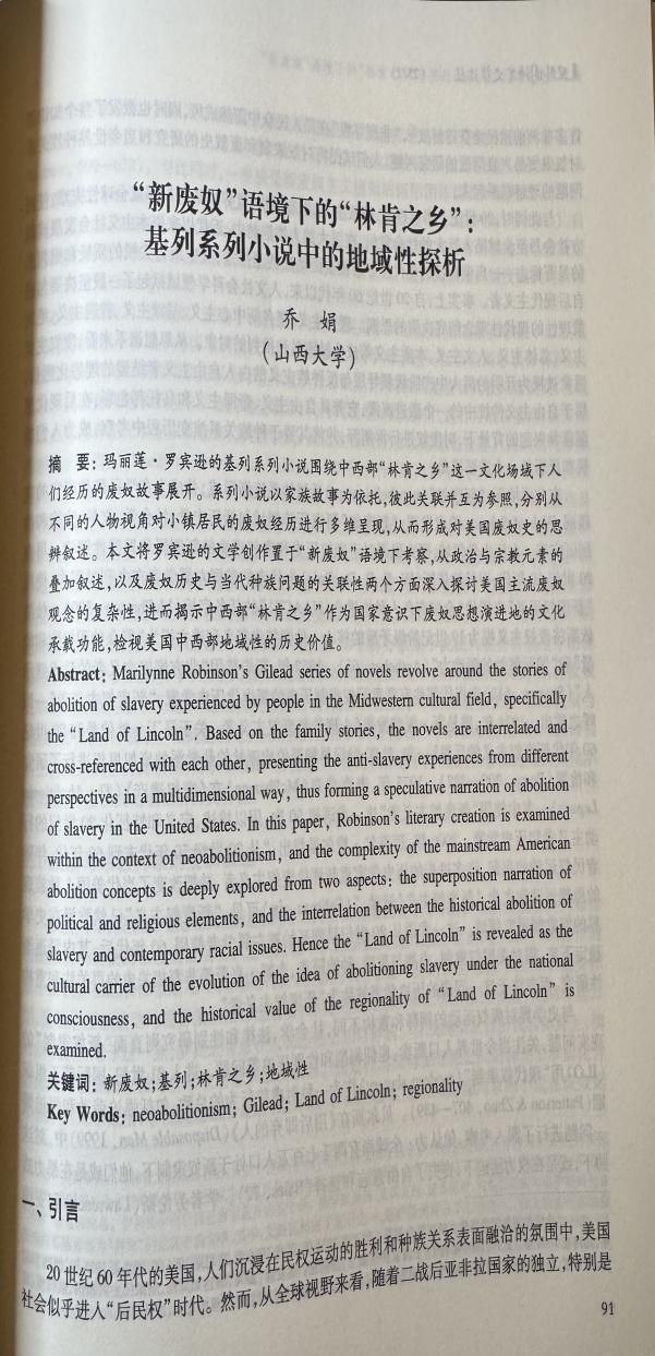 公司英语系教师乔娟副教授在《复旦外国语言文学论丛》2025年第2期发表题为《“新废奴”语境下的“林肯之乡”:基列系列小说中的地域性探析》的论文。该刊物由复旦大学外文学院主办,《论丛》坚持严格的遴选标准,所发文章立足点高、视角新颖、内容扎实,在学术界反响良好。刊物实行同行匿名评审,是中文社会科学引文索引(CSSCI)来源集刊;中国人文社科核心(AMI)A集刊,中国知网(CNKI)和万方数据(WFDB)收录全文,在业界影响广泛,在各种刊物评价体系中获得好评, 并获得相关领域专家学者的高度认可,主要为各大图书馆选购和收藏,已然是外国文学研究者的必读刊物。