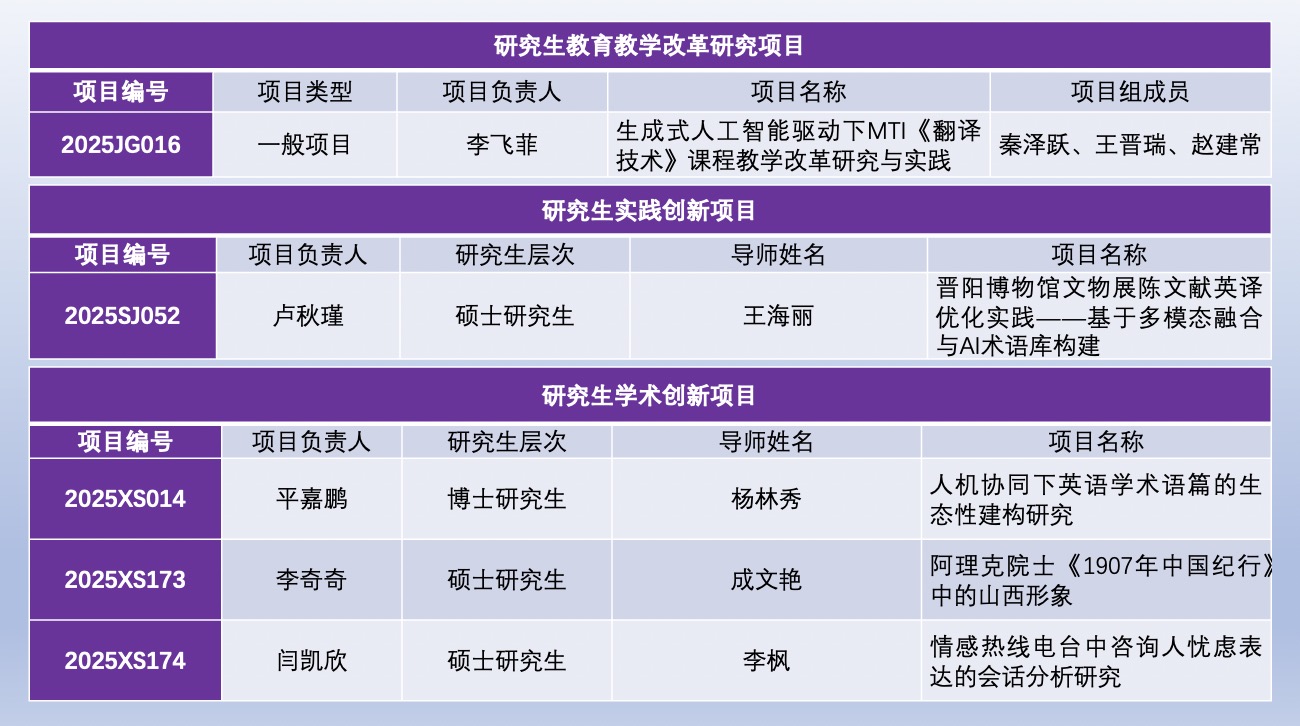 根据《山西省教育厅关于组织申报2025年度研究生教育创新计划各类项目的通知》要求,经各单位推荐、教育厅组织形式审查及专家评审,2025年度研究生教育创新计划各类项目拟立项名单于8月18日正式公示。公司在此次申报中取得优异成绩:李飞菲教师团队申报的《生成式人工智能驱动下MTI《翻译技术》课程教学改革研究与实践》项目成功入选;同时,研究生平嘉鹏、李奇奇、闫凯欣、卢秋瑾分别申报的《人机协同下英语学术语篇的生态性建构研究》《阿理克院士《1907年中国纪行》中的山西形象》《情感热线电台中咨询人忧虑表达的会话分析研究》《晋阳博物馆文物展陈文献英译优化实践——基于多模态融合与AI术语库构建》四个项目也获得立项。