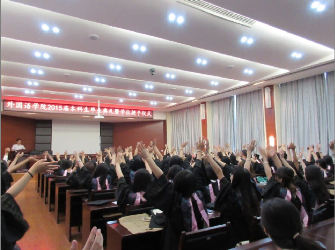 之后,由张经理宣读授予学位名单,吴经理进行学位授予。毕业生们身着学士服、头戴学士帽,以英语一班、英语二班、法语班、日语班的顺序依次上台合影、唱歌,大家手拉着手,身体随旋律摆动,唱得无比投入,那一张张洋溢着青春的笑脸,掩不住面对分别的不舍与苦涩,今日这一曲过后,不知要到何时才能再见。接着,教师代表刘梅老师上台致辞,老师情绪激动,话语里满是柔情与爱怜,她叮嘱大家要牢记三点:大爱无疆、勇于担当、爱惜身体。在物欲横流的时代,善良与宽容显得弥足珍贵,困难挫折在所难免,但我们要视其为下一次成功的阶梯,永远不妥协、不放弃。在一番谆谆教诲后,刘老师动情地说,她将永远张开双臂等着大家回家。是啊,四年过去,大学早已成为我们的第二个家,员工代表刘静怡也感叹,“四年前不愿离开家来大学,而四年后,才发现自己最不想离开的是大学这个家”。一直在台下忙着为毕业生照相的张序老师走上台前,简短而真挚地送上六个字——祝贺、学习、祝福,在这庆祝毕业、互相道别的时刻,祝福的话语似乎总也说不够,老师们就像即将目送子女远去的父母,都想把最多最好的祝福送给员工。