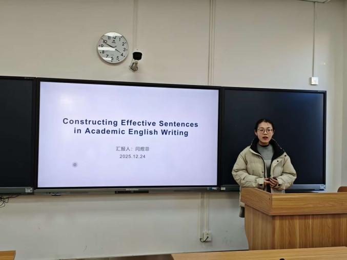 闫煜菲老师以“学术英语写作中如何构建有效句子”为题,对英语句型进行了系统梳理。她从功能、结构与修辞三个维度展开分类,并结合实例深入阐释,最后精要总结了不同语境下的句型应用原则:简单句适用于强调论点,复合句利于展现逻辑,而修辞性句式则能提升表达力度与文本节奏,为学术写作提供了清晰实用的句式选择指南。