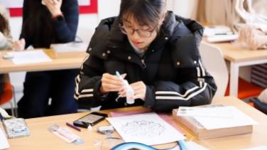 美术学院美育主讲人胡梦雯系统地介绍了衍纸艺术的源流、特色、制作工艺与艺术价值,引导大家深入挖掘传统纹样的深厚内涵,领略衍纸艺术的独特魅力。随后美术学院的同学为每一位参与者分发了物料。工作台上瞬间铺开了缤纷的色彩。在美院“小老师”们一对一指导下,大家逐渐掌握了卷纸的力度与技巧,纷纷发挥创意,设计起多样化的图案。制作衍纸,需要的不只是纸条,更是一份耐心与巧思。力度决定形状,色彩传递情绪,细节成就作品。