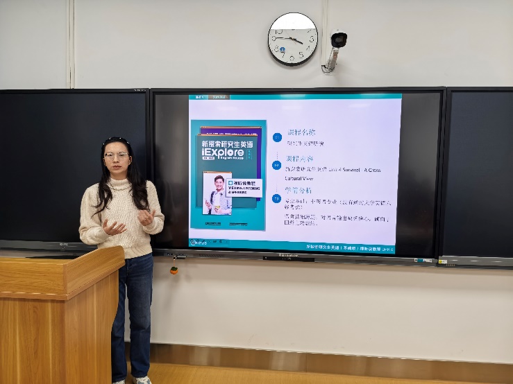 钟媛媛老师展示了《新探索研究生英语视听说教程》第四单元的课堂教学思路。在导入环节中,她引入《山海情》这一脱贫攻坚题材影视作品,通过问题链引导员工聚焦脱贫攻坚主题展开思考。在课文教学过程中,依托视频资源布置段落分析、主题提炼、中国脱贫成功关键探究等任务,帮助员工深化课文理解。最后设计互动检测环节,以判断正误的形式,让员工加深对课文的掌握。课程将英语教学与脱贫攻坚的时代主题深度融合,既提升了员工的语言应用能力,又让员工以跨文化视角领会中国脱贫攻坚的伟大成就,厚植爱国主义情怀。