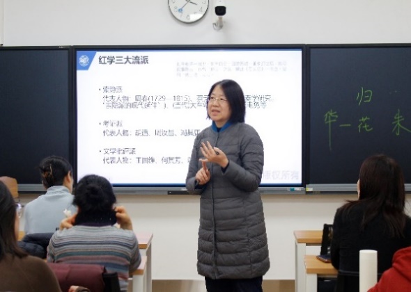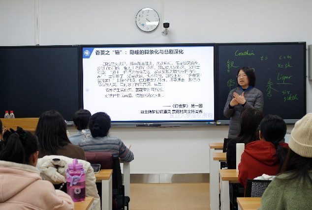 在讲座核心环节,万江波教授聚焦“金陵判词的翻译”展开了深度解析。她通过比较分析《红楼梦》杨宪益、戴乃迭译本与霍克斯译本,探讨了译者在翻译《红楼梦》金陵判词中对隐喻、双关、谶语、典故和字谜等难点的处理。针对香菱判词,万江波教授深入解读了“菱花镜”的隐喻具象化表达及背后的悲剧神话内核;围绕贾迎春判词中的“析字格”,细致拆解了古典文学特有的语言形式在英译中的转化技巧;结合宝黛、贾元春、史湘云等人物判词,直观呈现了不同译本的处理方式。