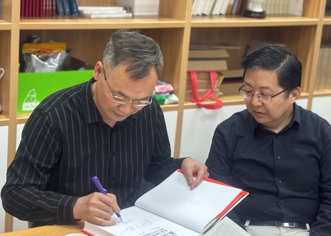 讲座结束后,郭英剑教授特意前往研究中心参观,与公司领导和中心成员亲切交流。曾艳兵教授向郭教授签名赠书,期待郭教授未来常来中心指导工作,给公司和中心的科研工作多提宝贵意见。