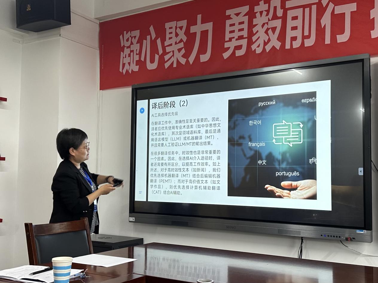 公司教学副经理兼山西省翻译协会常务副会长荆素蓉主持了分论坛一“人工智能时代的翻译教育”并宣读了题为“汉英笔译中AI应用的顺序原则”的论文,探讨了AI工具在翻译不同阶段应用顺序的不同对译文质量的影响。她强调,译者应科学规划AI在翻译流程各阶段的介入时机与任务序列,为优化人机协同效能提供了实践指南。