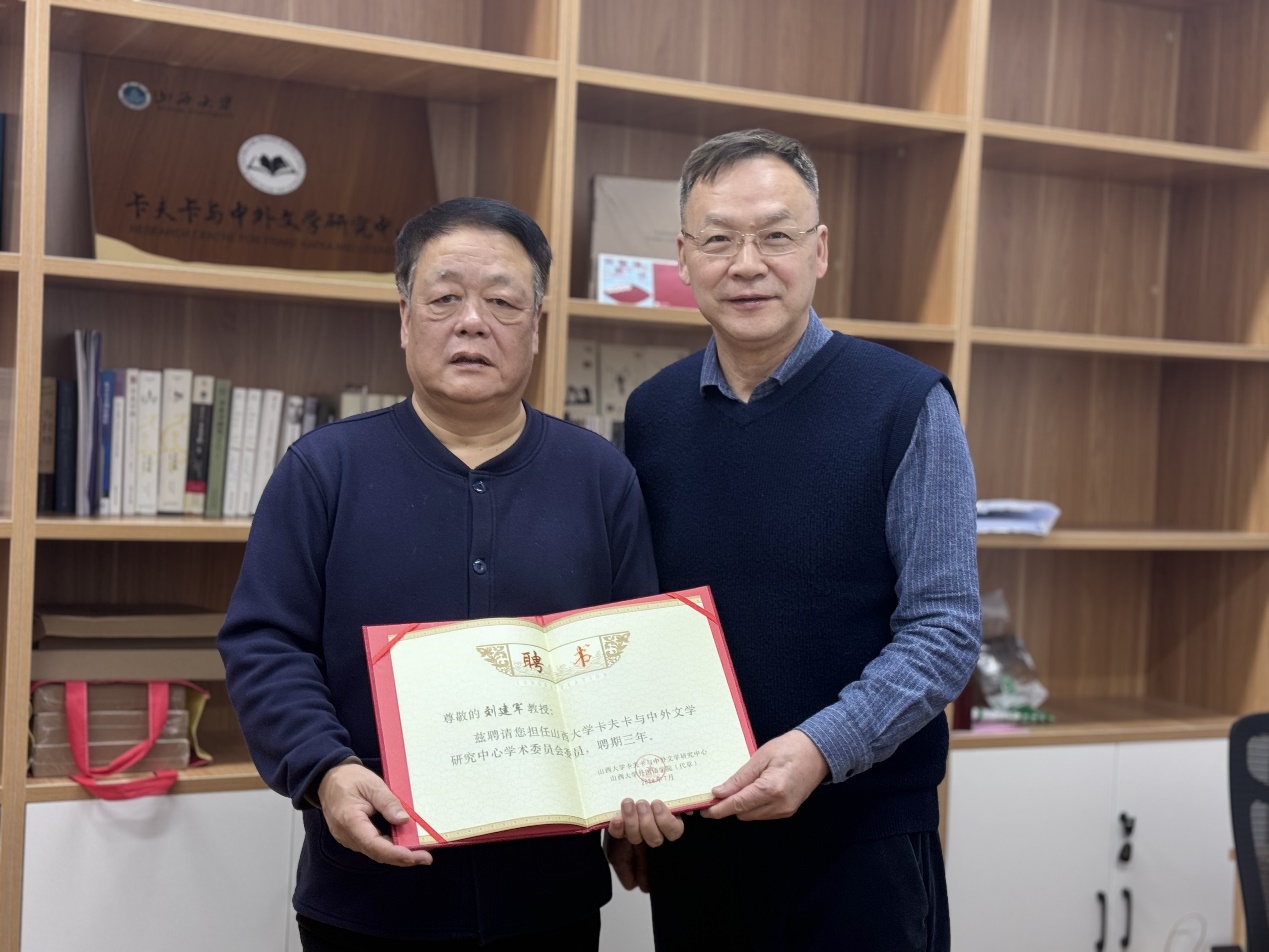 讲座结束后,刘建军教授特意前往研究中心参观,与中心成员亲切交流。曾艳兵教授为刘教授颁发山西大学卡夫卡与中外文学研究中心学术委员会委员聘书,期待刘教授未来常来中心指导工作,给中心的科研工作多提宝贵意见。